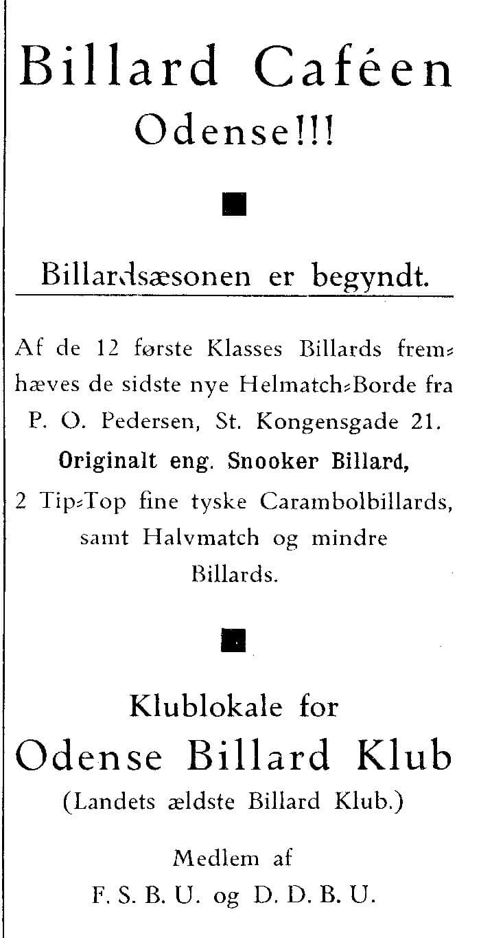 Fornylig har vi spillet Klubmesterskabet med stor Deltagelse. Klubmester blev John Jacobsen. _.- men det skal dog bemærkes, at her deltog Hr. Madsen ikke, ,- sikkert paa Grund af de mange “Pinsesnit”, han skulde have færdige. Nu kunde vi som Slut paa Sæsonen tænke os at faa den Kamp med Svendborg Billardklub, som snart det sidste Aar har været os lovet, hvad siger min gode Ven Davidsen, Formand for Svendborg Billardklub til dette? Mon Tiden er inde nu, selvom det er lidt sent paa Sæsonen? Men jeg tror afgjort, at hvis vi henvendte os til Aarhus Billard Club om en Match, vilde vore Venner der sikkert hurtigt give os Svar herpaa. Jeg kan i samme Aandedræt meddele Aarhus, at “Palle”s hest er i god Stand, pudset og poleret og at den med Længsel venter paa snarligt gensyn med den gamle Stald i Aarhus. Til slut vil jeg paa “Bristol”-Kammeraternes og egne Vegne bringe en Hilsen til vore Venner i Aarhus og Svendborg.